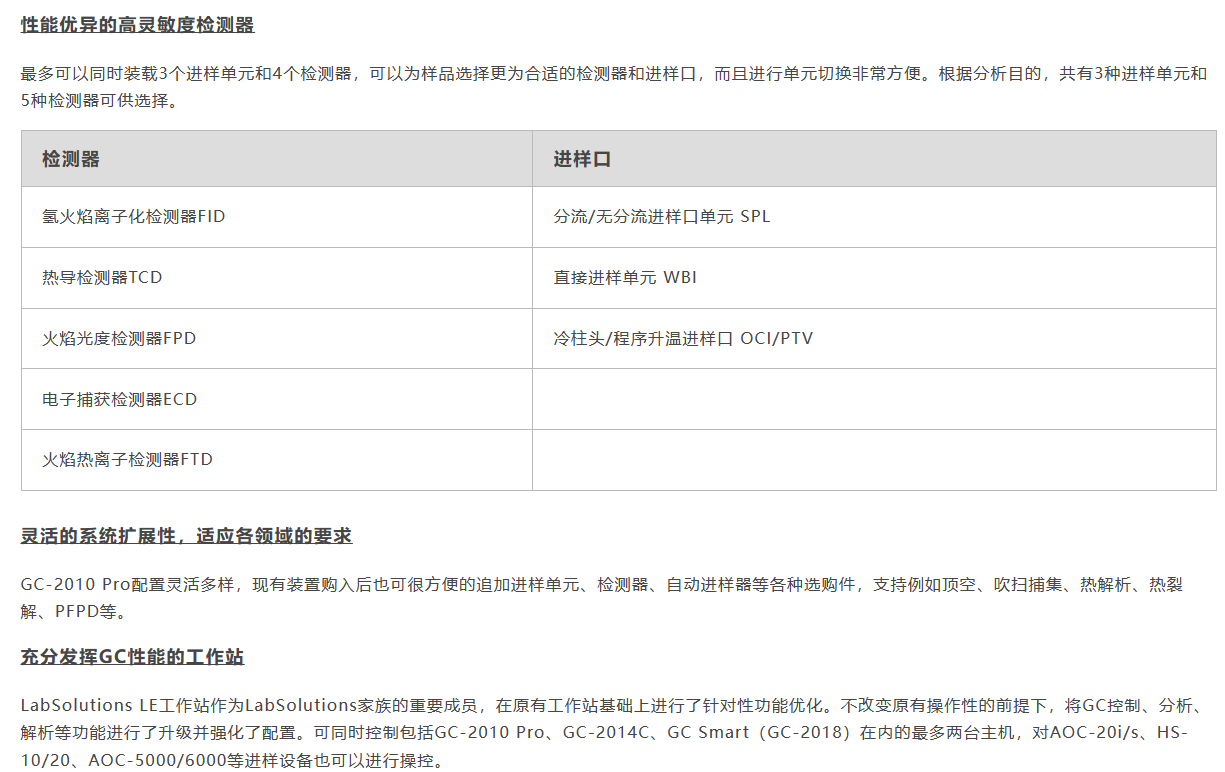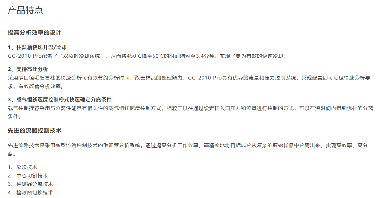 GC-2010 Pro继承了高性能毛细柱气相色谱GC- 2010 Plus的基本性能。其良好的重现性确保其具备高可靠性。其高性能检测器使高精度、高灵敏度分析得以实现。同时,高速柱温箱冷却技术可大幅缩短分析时间,是一款能够满足各种分析需求、提高生产效率的气相色谱仪产品。